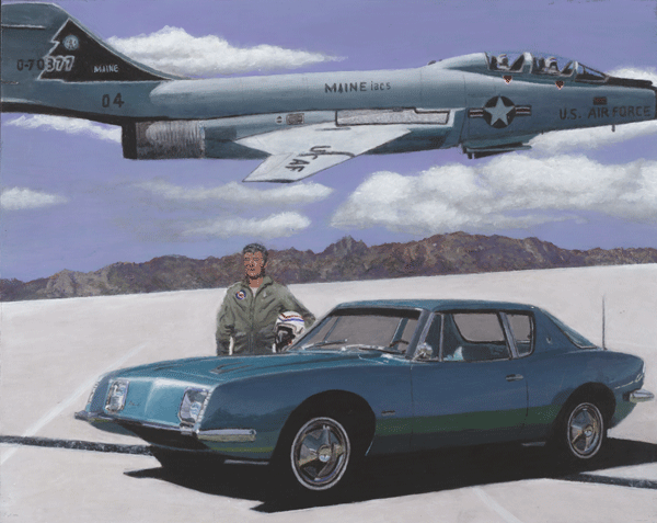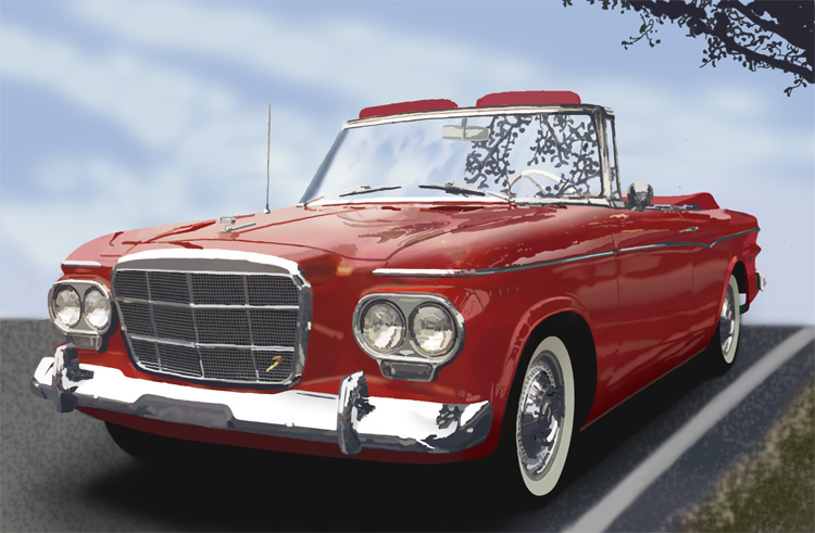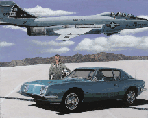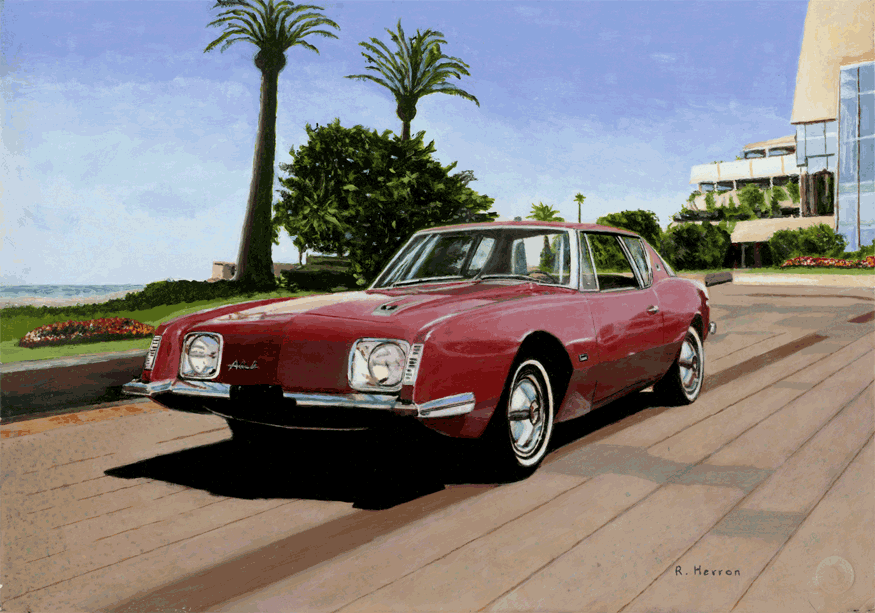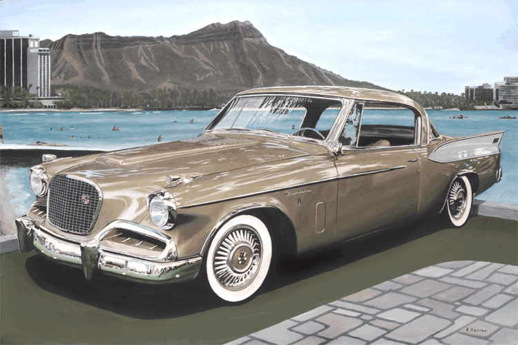“Speed” Both the Avantin and the Voodoo (F101) set speed records in their time. the background represents the Bonneville Salt Flats and the individual by the car is Dick Vaux who piloted and F101 and owns the first production 1964 Avanti, which in its time was widely photographed. 22" by 17" Giclee from digital acrylic painting. “An American In Cannes” A 1964 Avanti is depicted in front of the Cannes Film Festival building in Cannes, France. Raymond Loewy was born in France and later became one of America's premier industrial designer credited with creating the Coca Cola bottle, the paint scheme for Air Force One and many other recognizable designs. His company was responsible for many Studebaker designs and when not in the US he and his family lived in southern France. 22" by 17" Giclee from digital acrylic painting. “Goldenhawk At Diamondhead, HI” The Goldenhawk was sometimes considered a sports car. 22" by 17" Giclee from digital acrylic painting. “DreamTime” The Lark was a very popular high performance compact and could have saved Studebaker if it had been introduced earlier. 22" by 17" Giclee from digital acrylic painting. The Avanti in the painting and on the cover of the 2005 AOAI Calendar belongs to Robert Proodian. Robert commissioned the artist's first painting depicting the same car, a 1964 Avanti, without a background. For